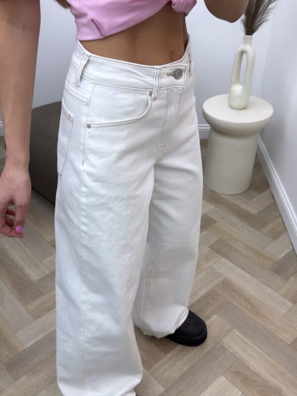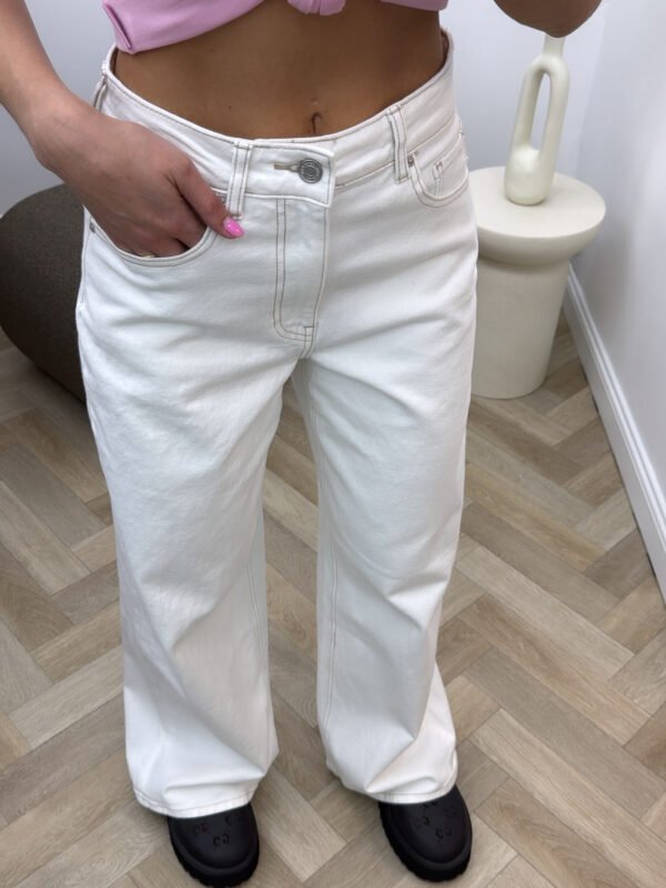 Balti džinsai rudomis siūlėmis