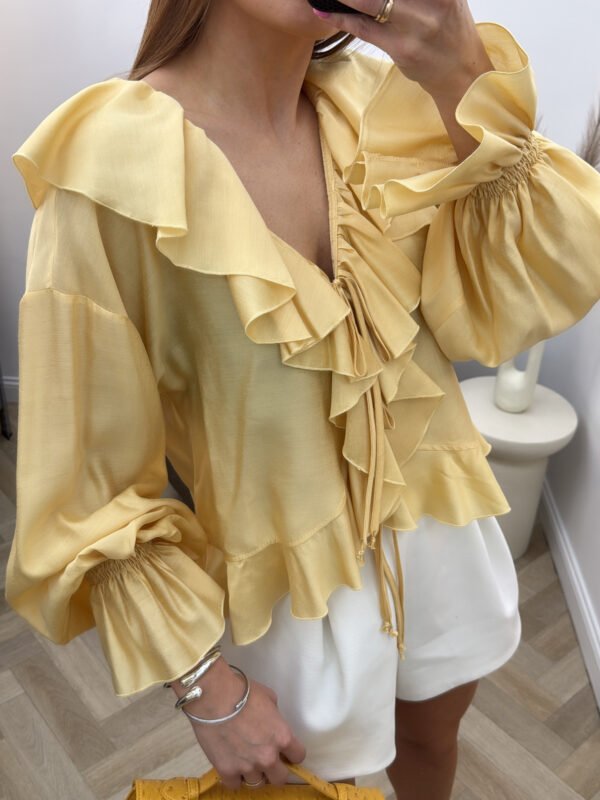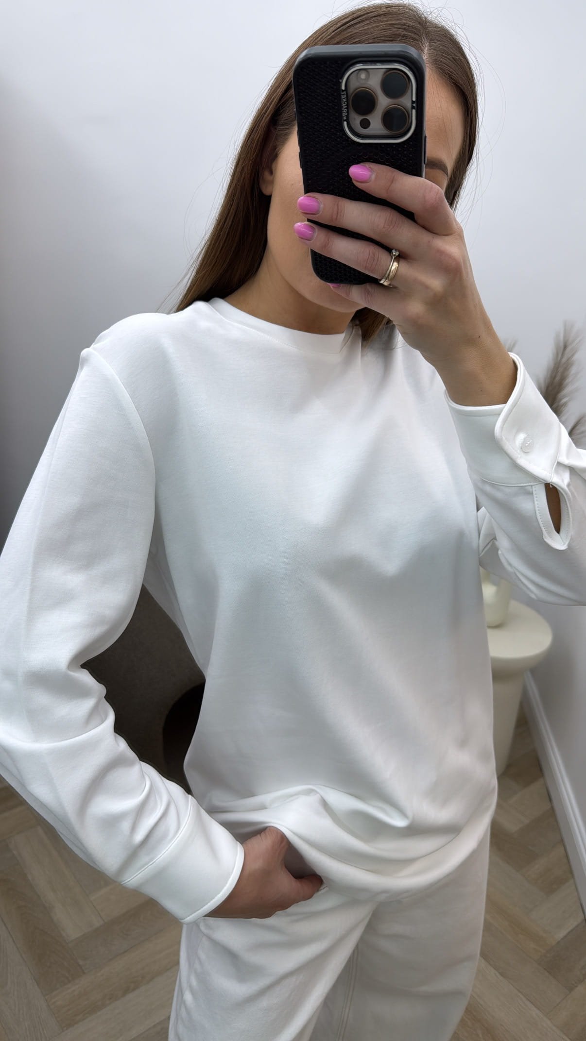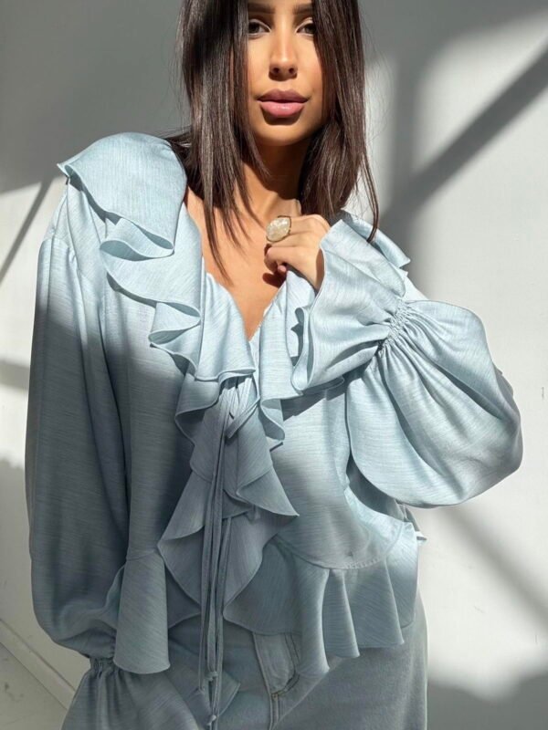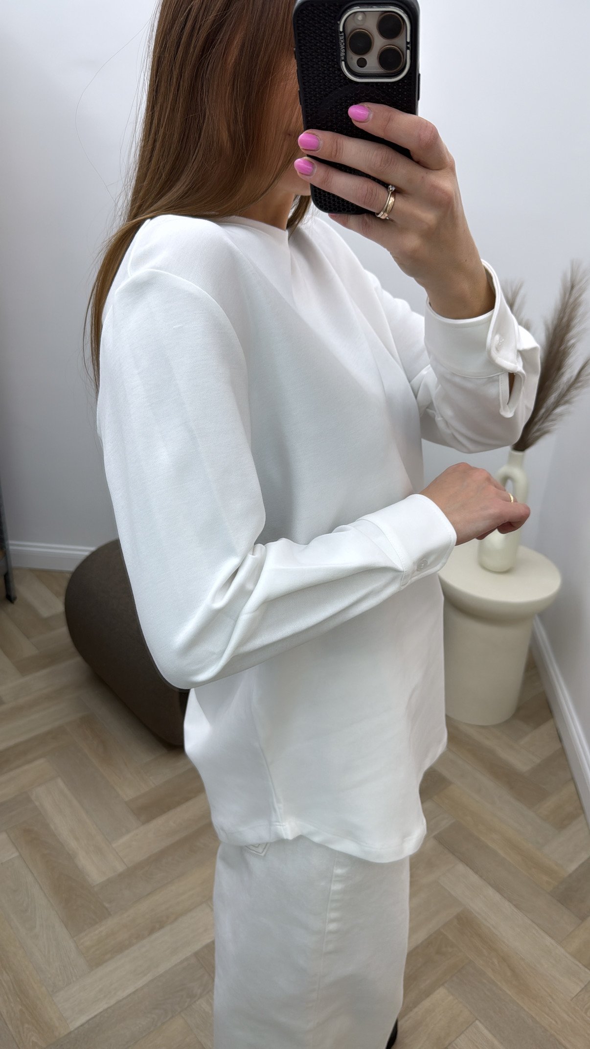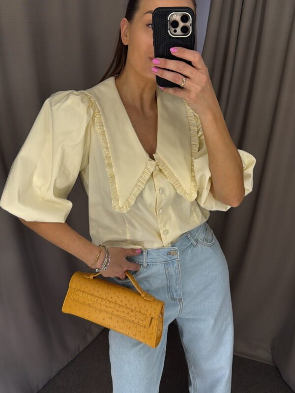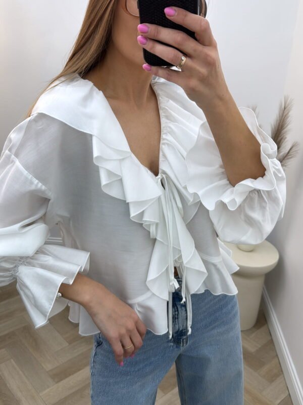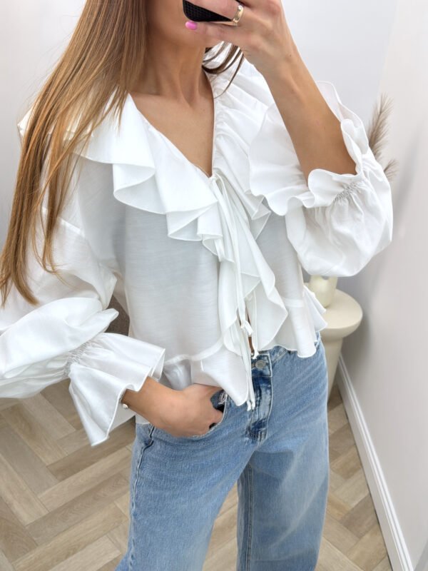 Baltos spalvos, ilgomis rankovėmis medvilninė palaidinė.