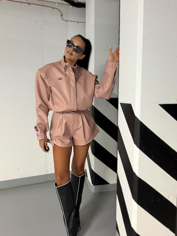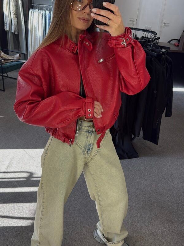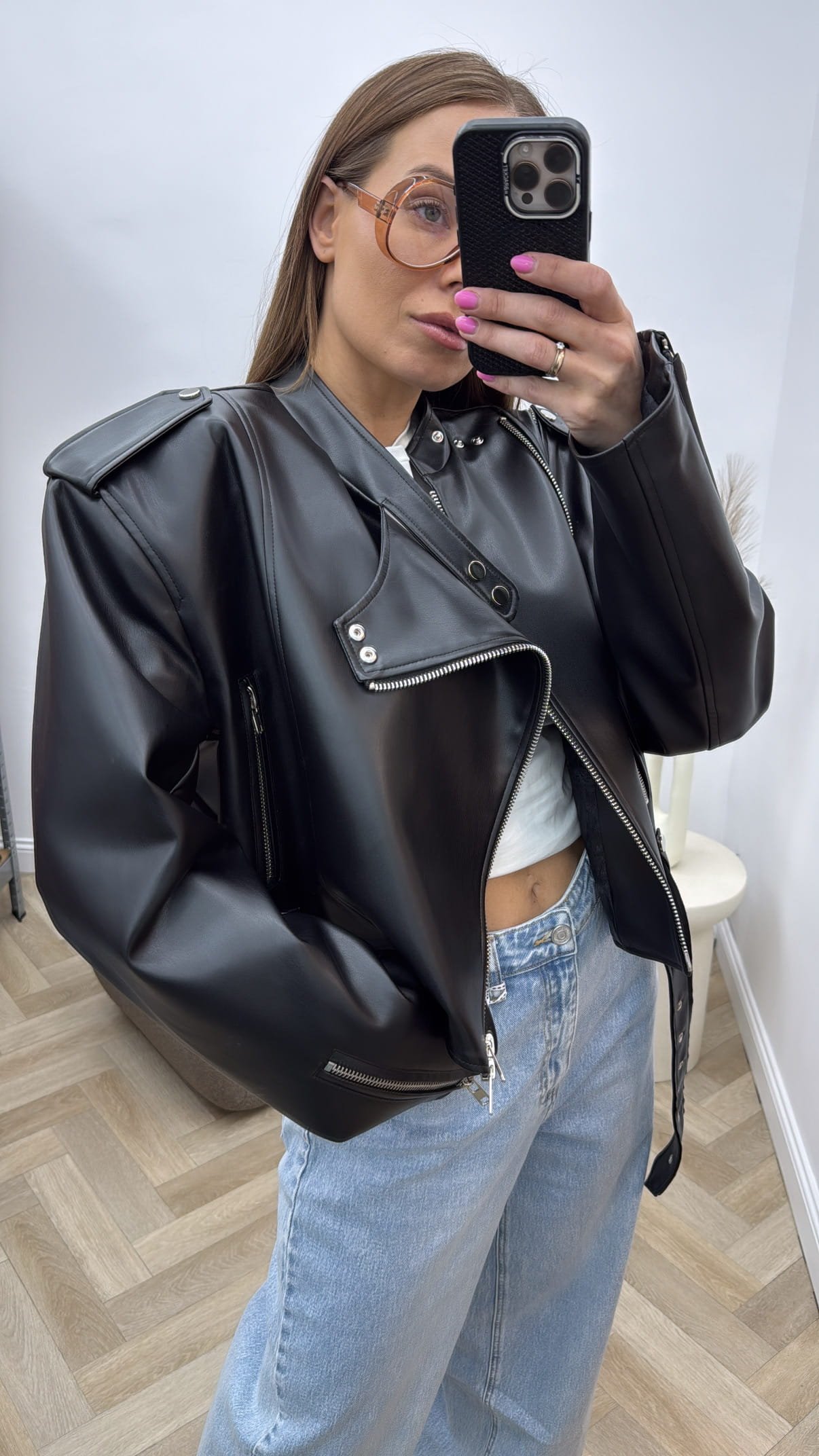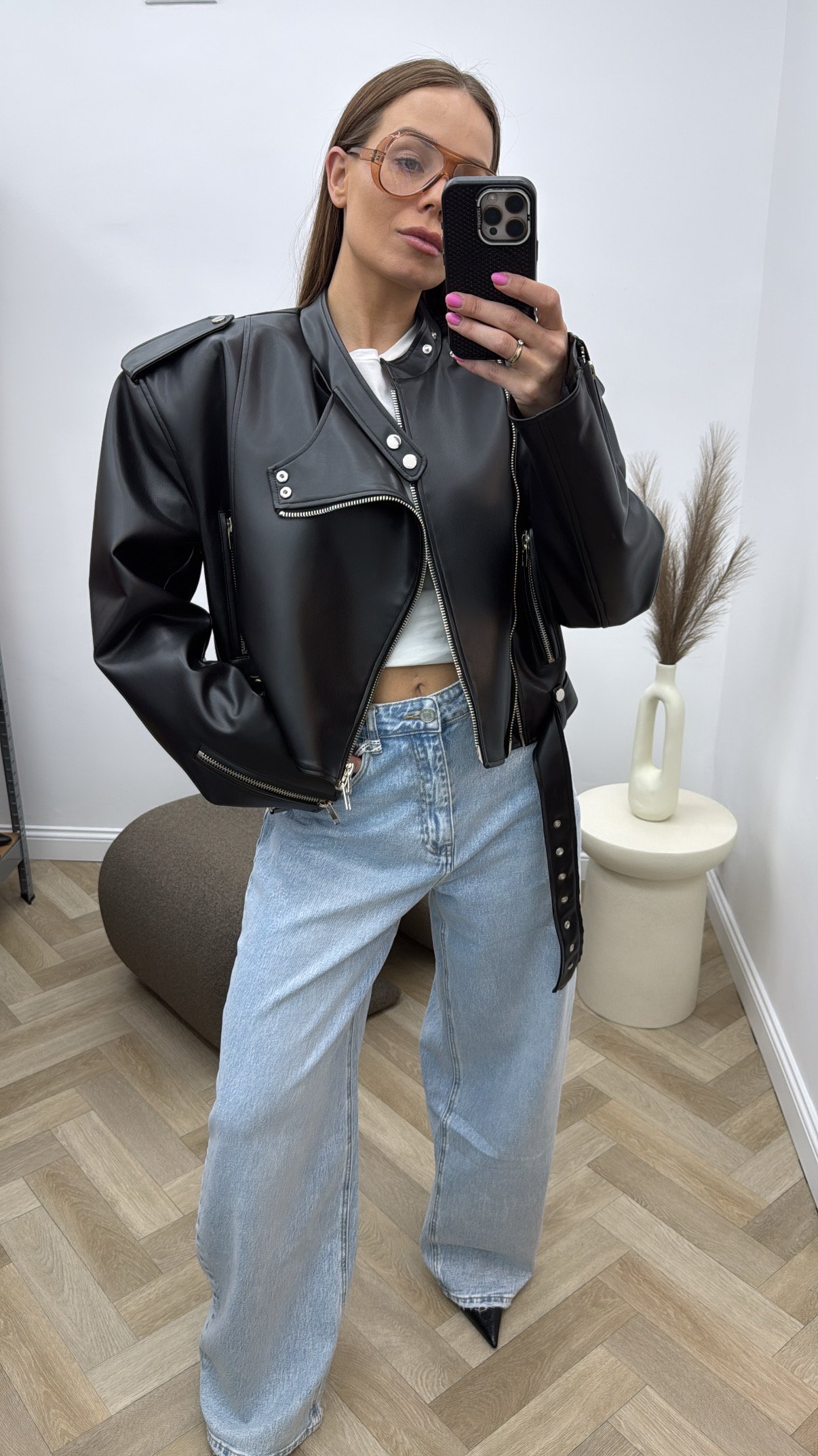 Juodos spalvos, eko odos striukė. Oversize modelio, su petukais.