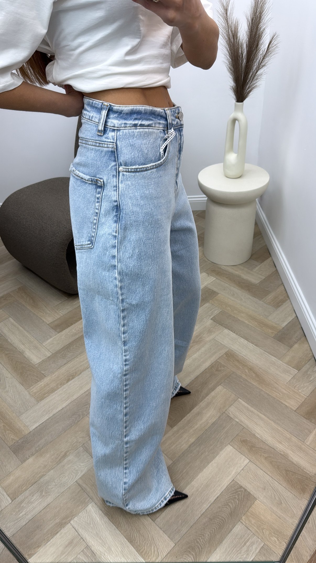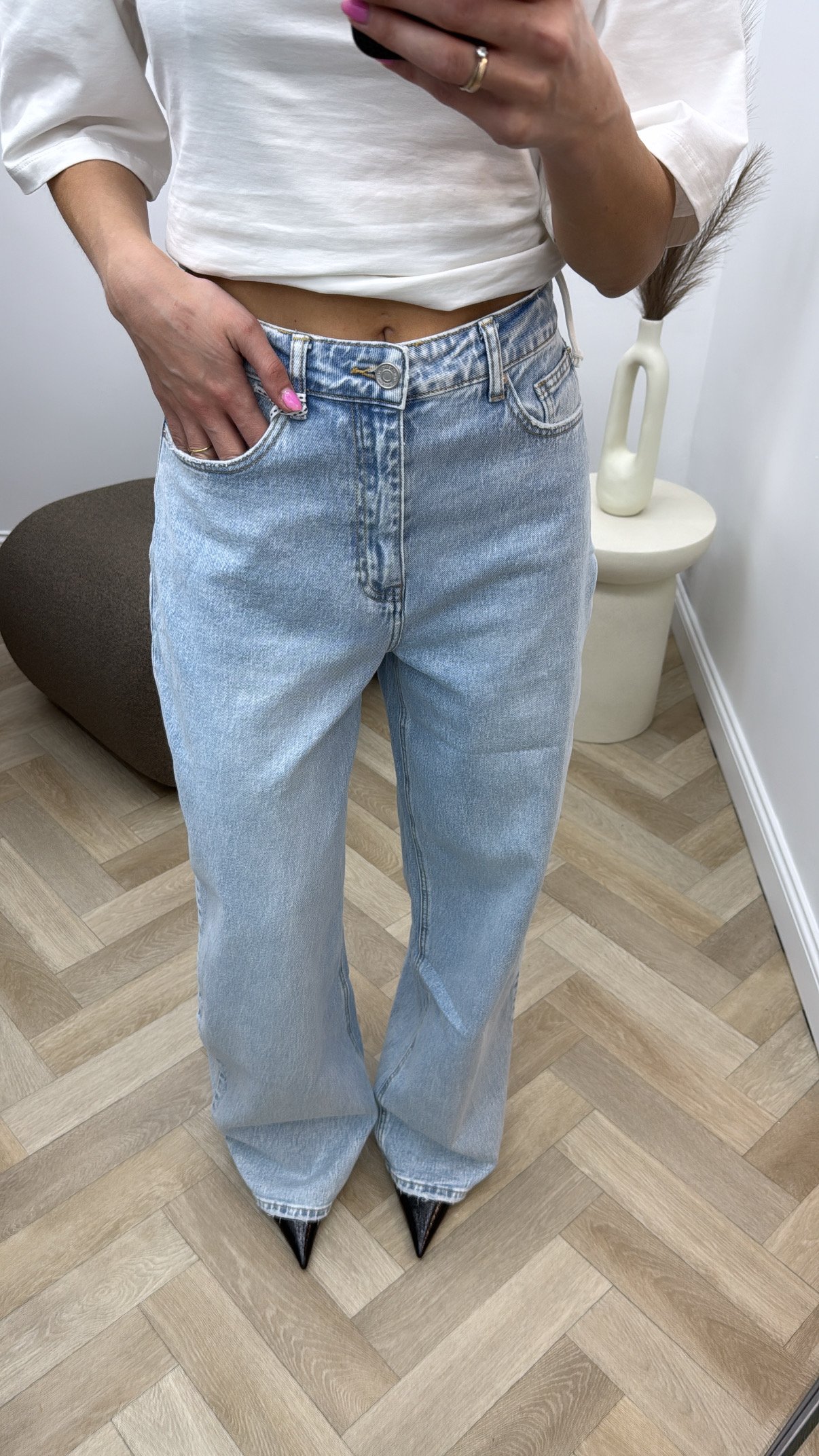 Šviesiai mėlyni ,baggy modelio, džinsai tinkantys aukštoms merginoms.