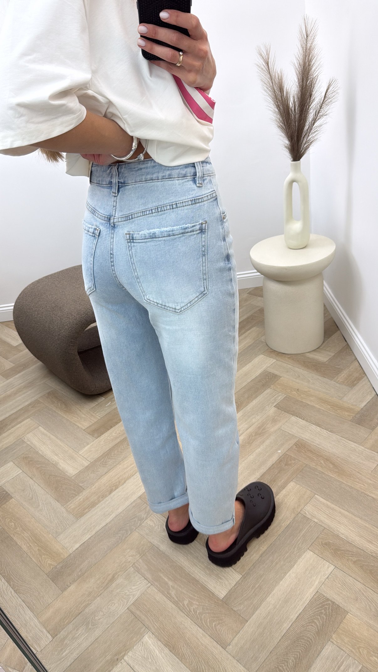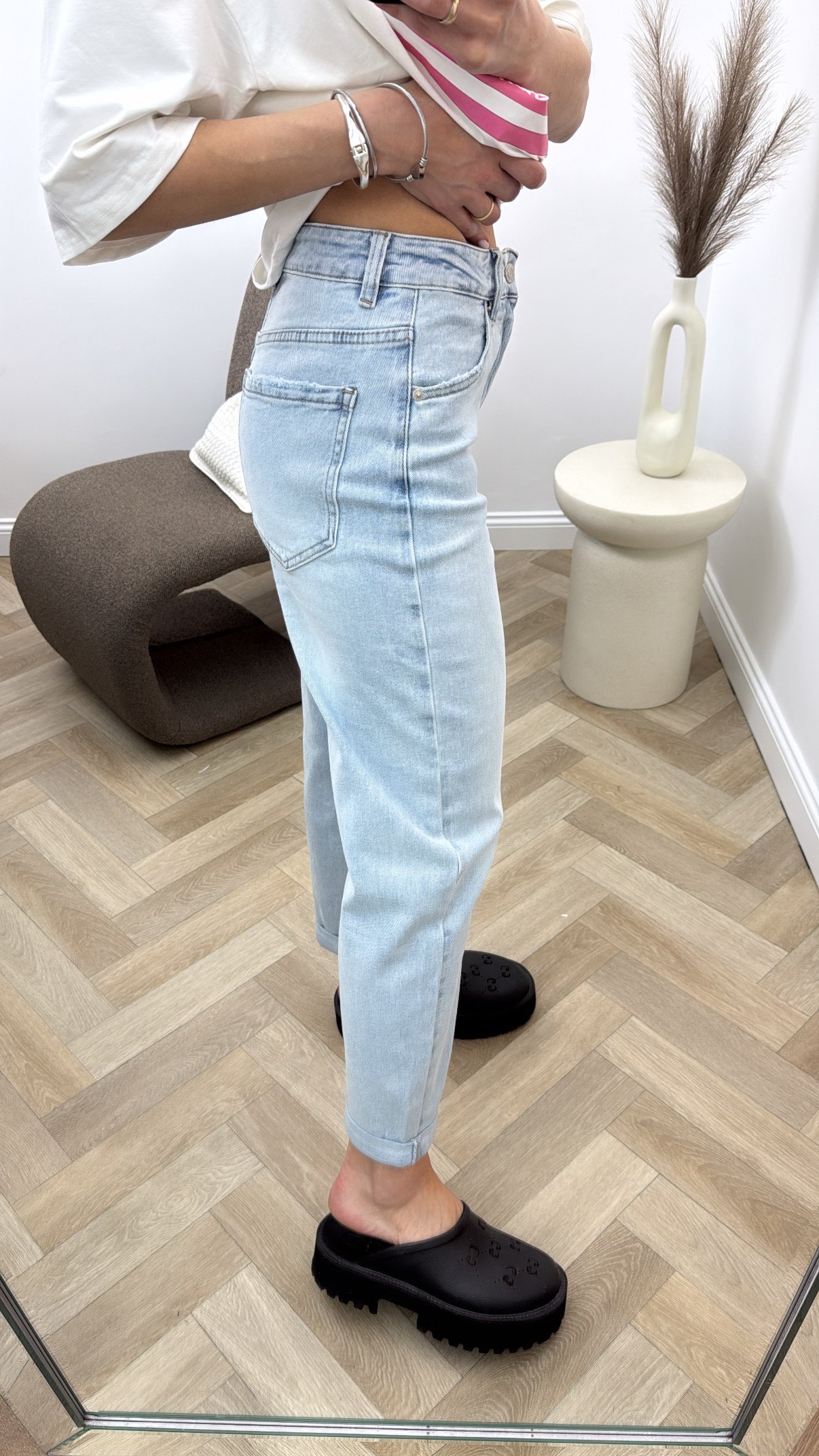 Šviesiai mėlyni mom fit modelio džinsai – patogus ir universalus pasirinkimas kasdienai. Su elastanu, tad tamprūs ir patogūs.