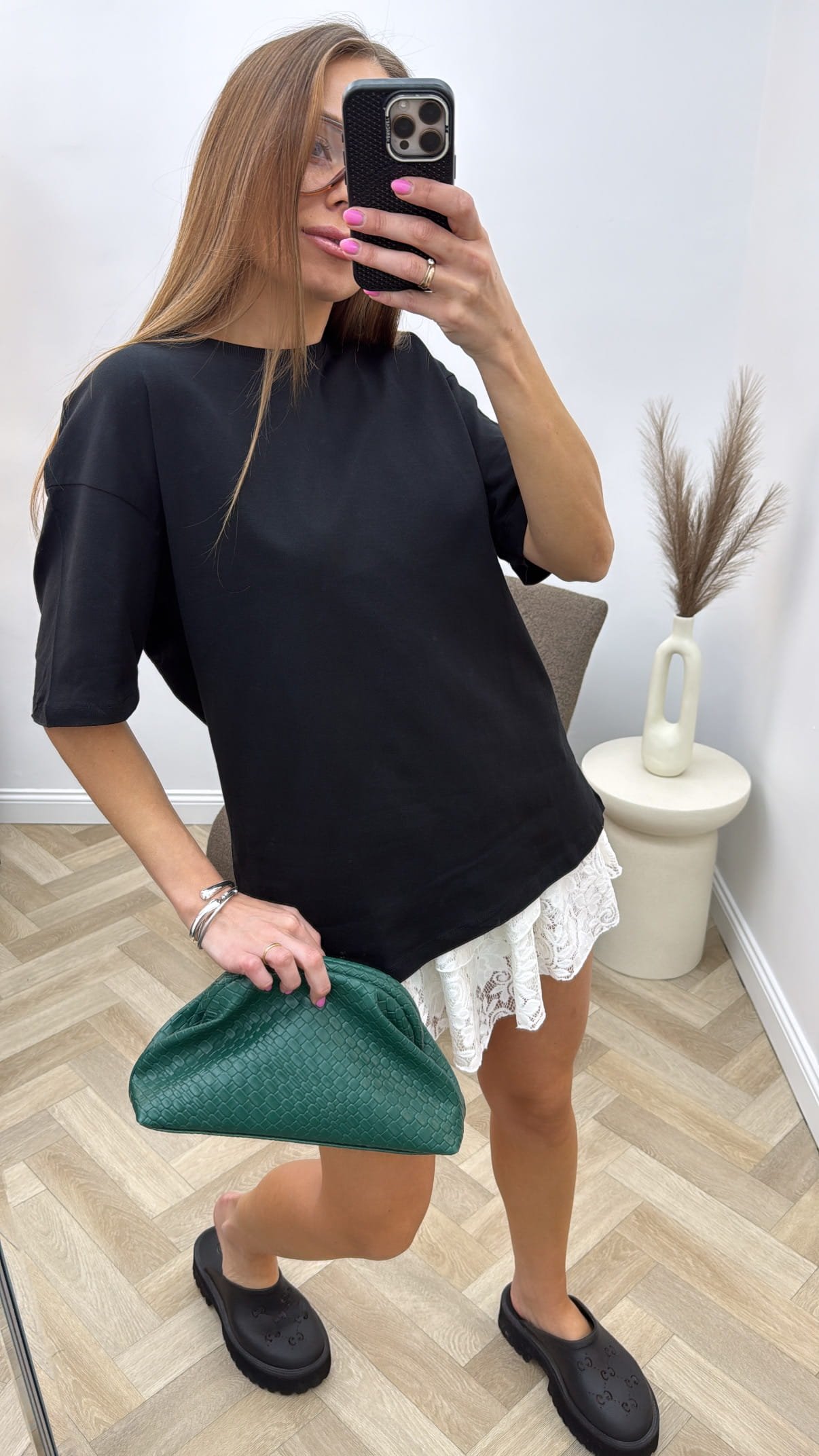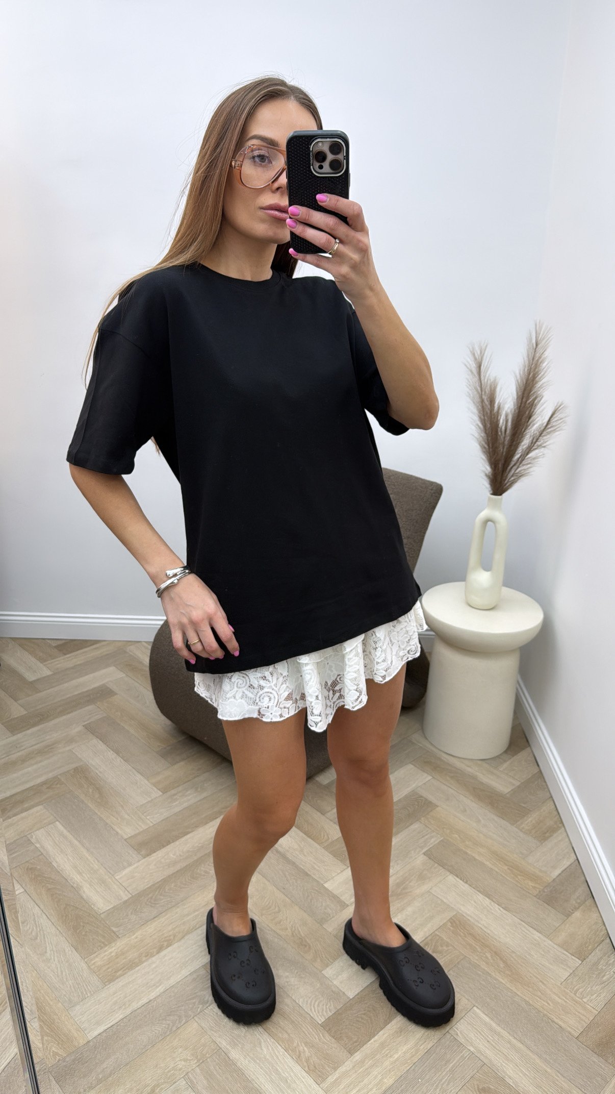 Juodi marškinėliai, ilgesnio, oversize modelio.