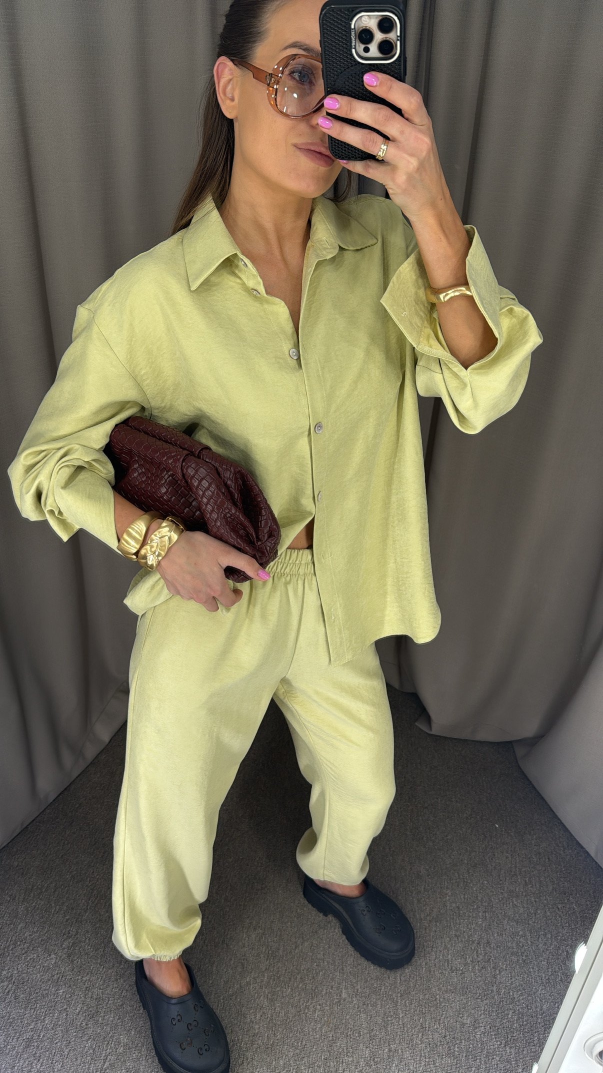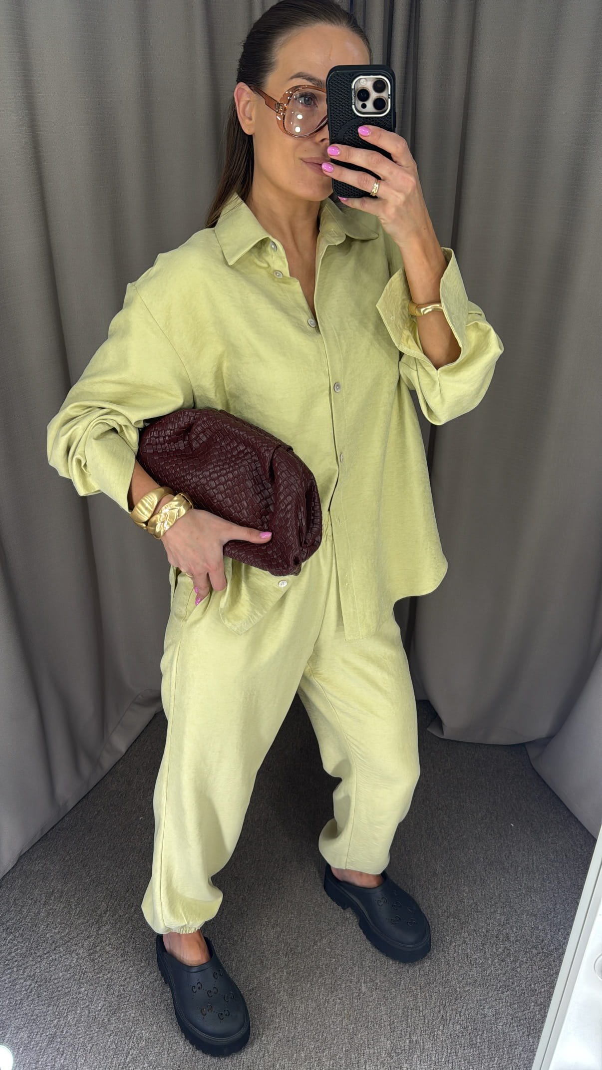 Laisvo stiliaus marškinių ir kelnių komplektas.