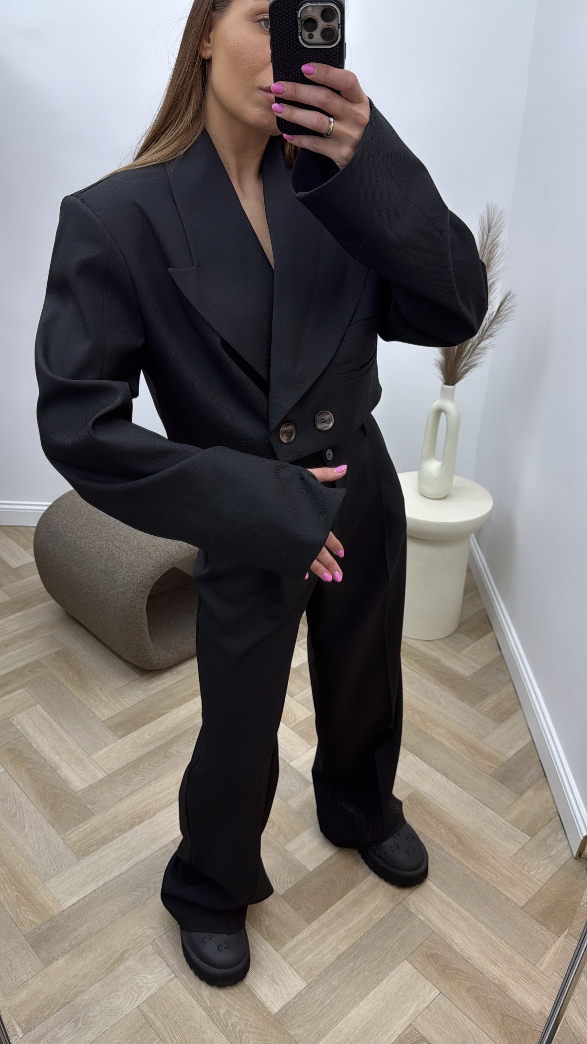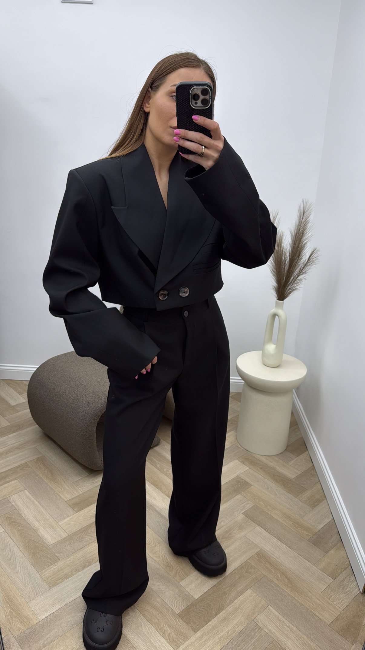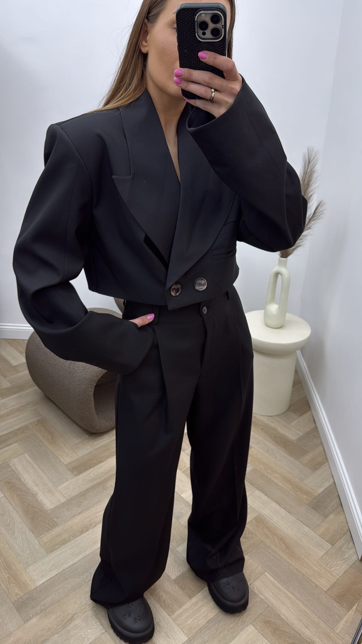 Juodas kostiumėlis su trumpu oversize švarkeliu ir juodomis klasikinėmis kelnėmis.
