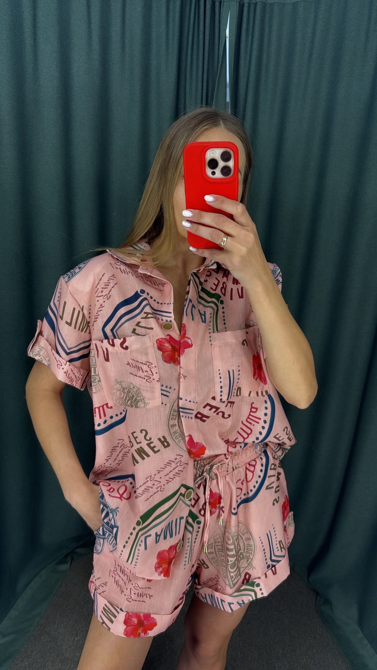 Vasariškas, laisvo stiliaus, oversize modelio marškinių ir šortų komplektas.