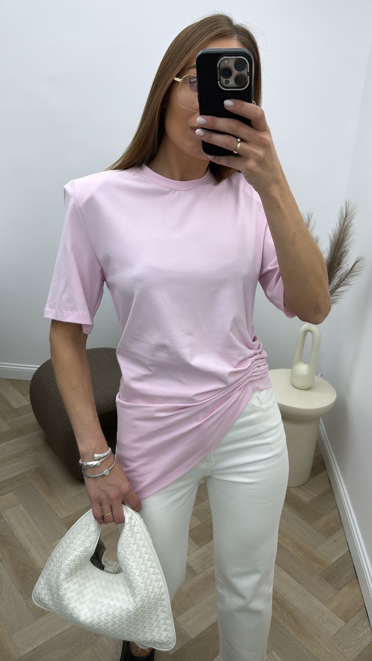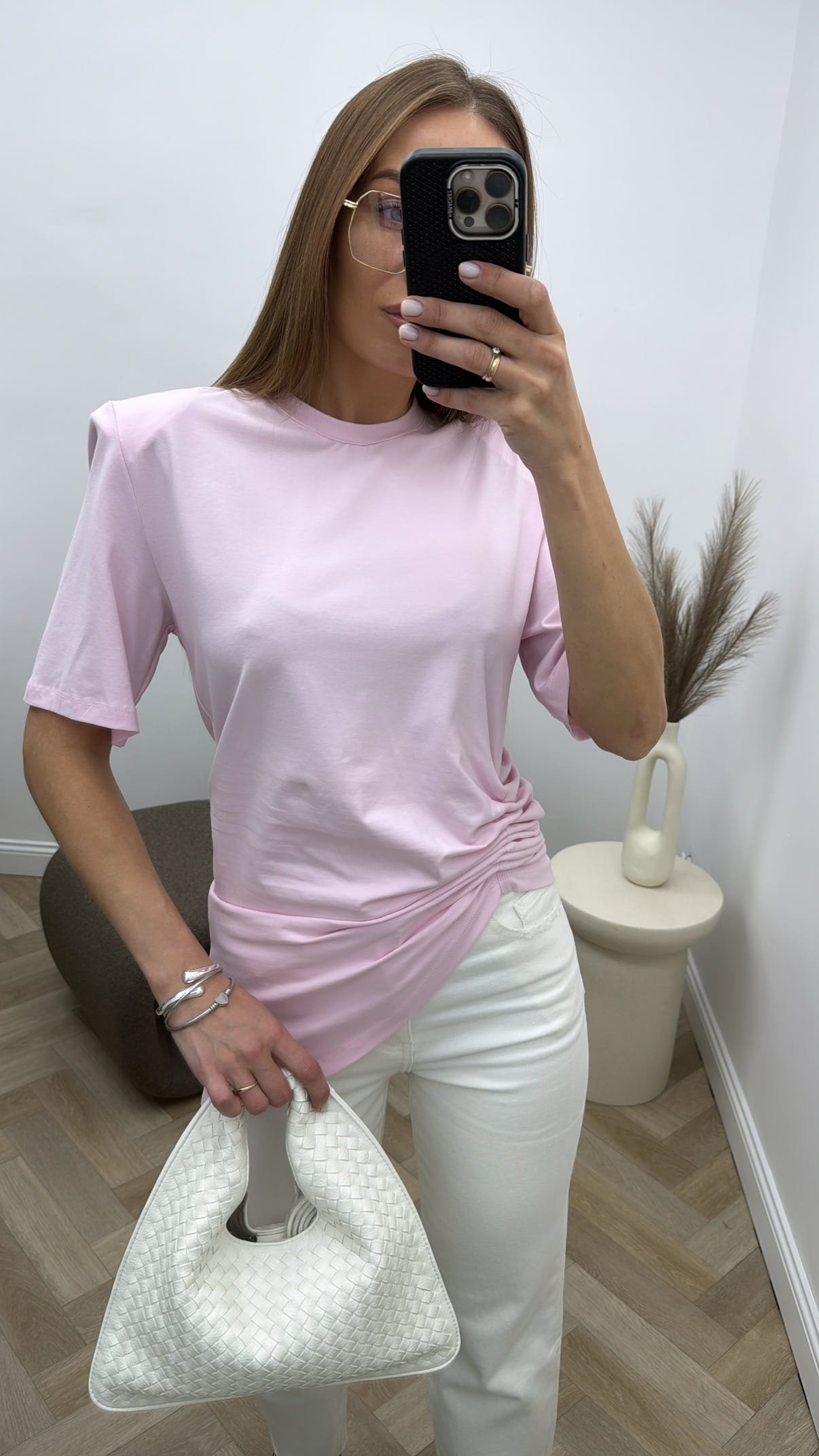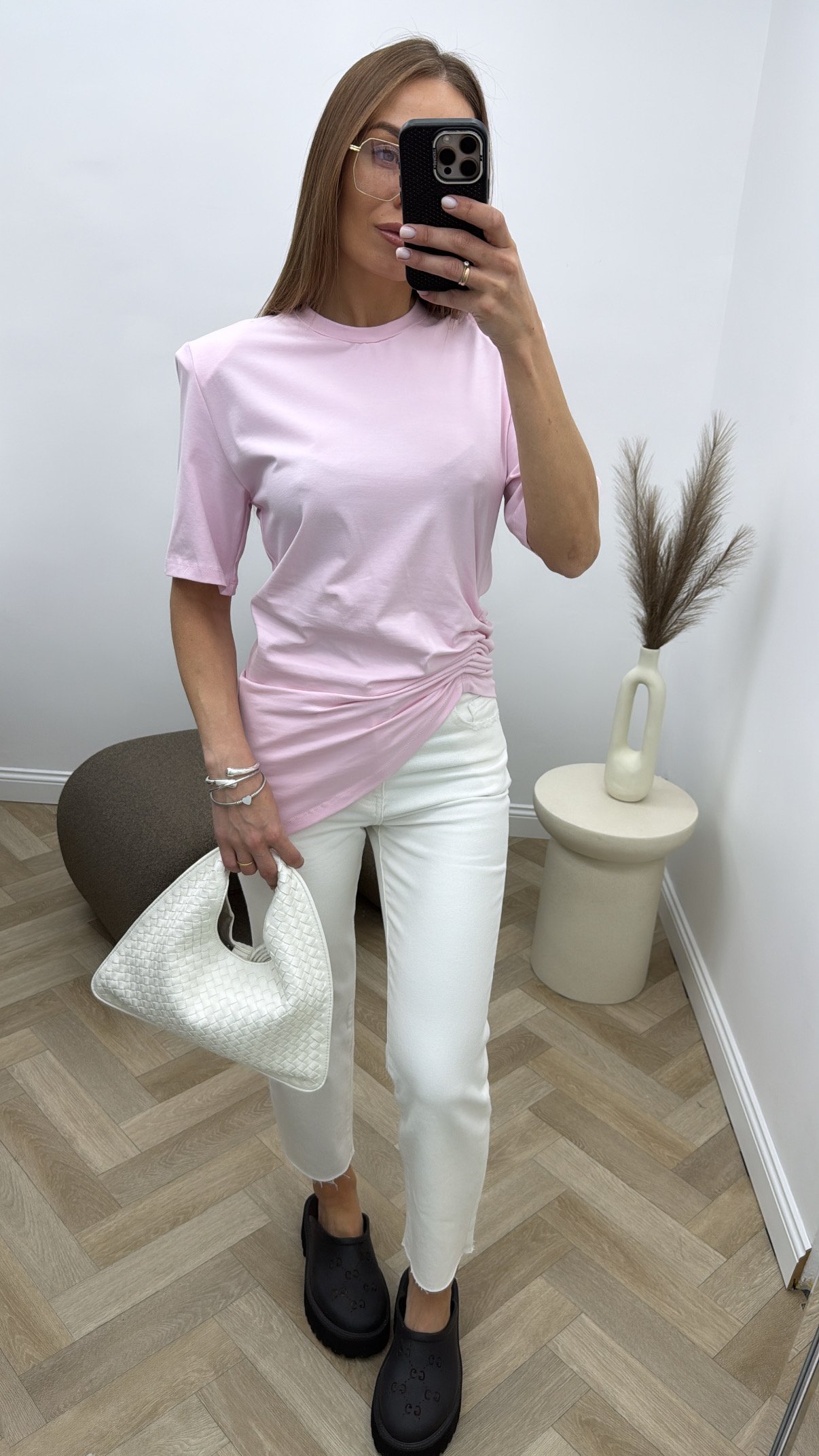 Kreivo kirpimo palaidinė, su suraukimu šone bei petukais petukais.