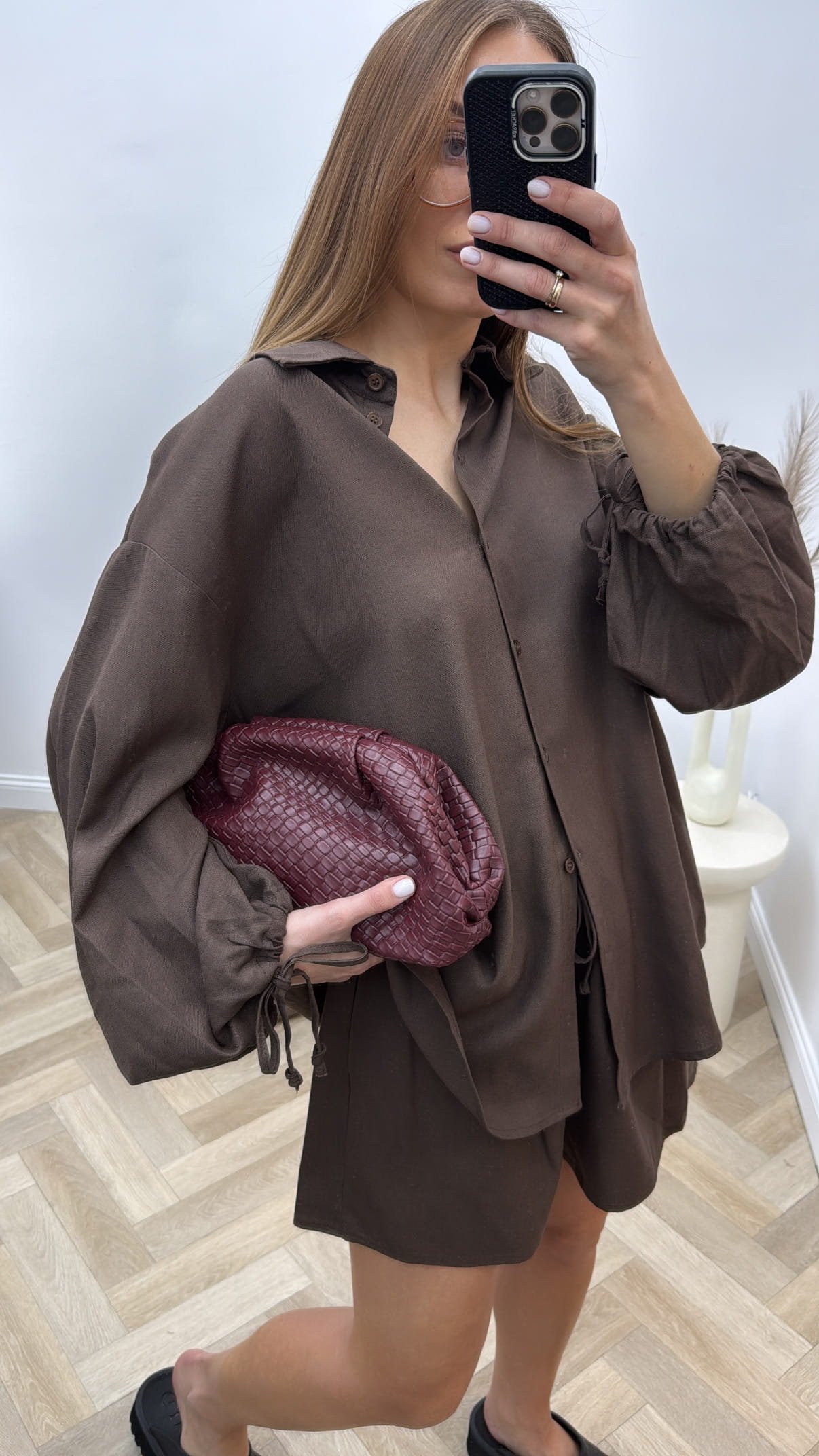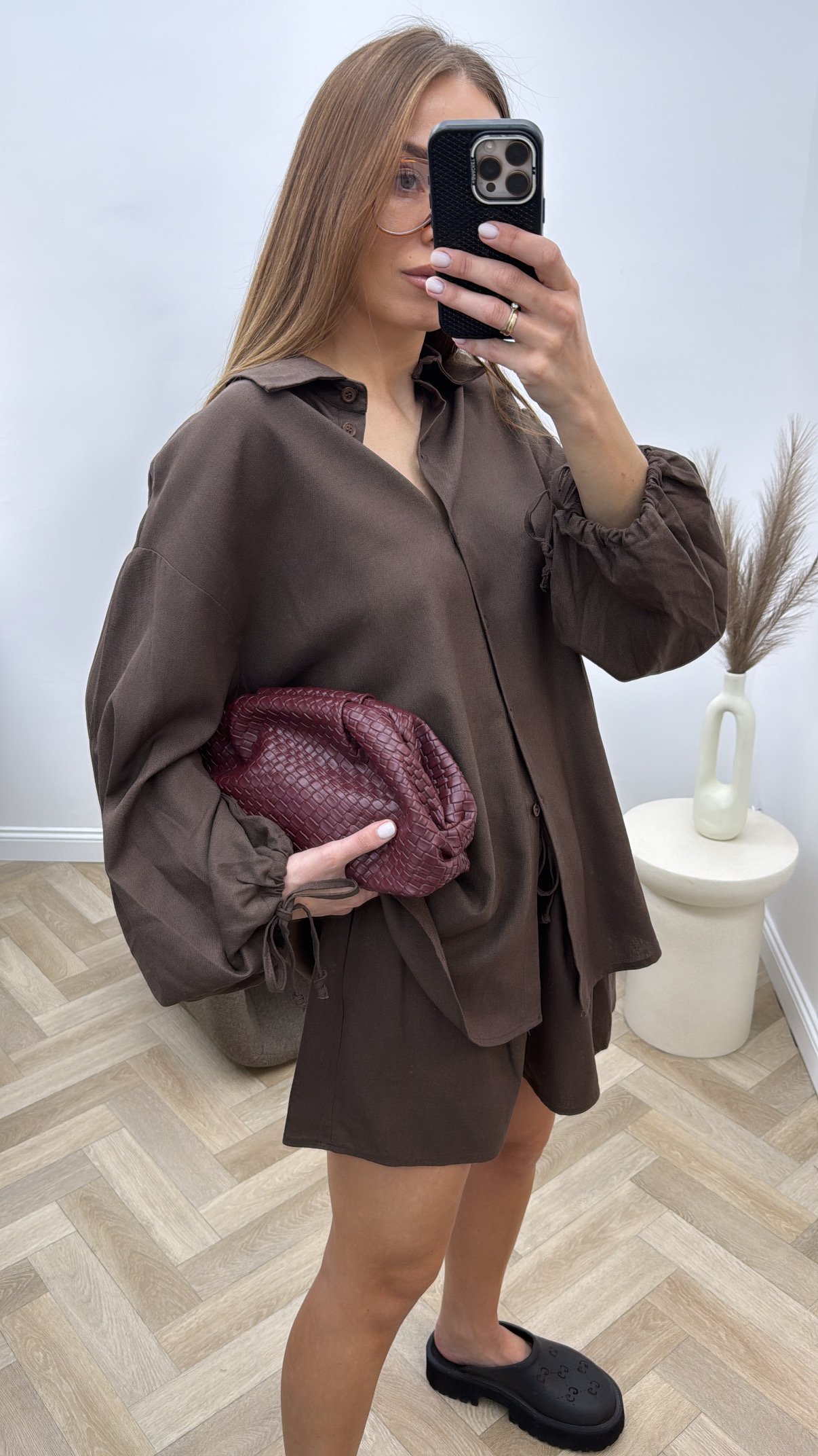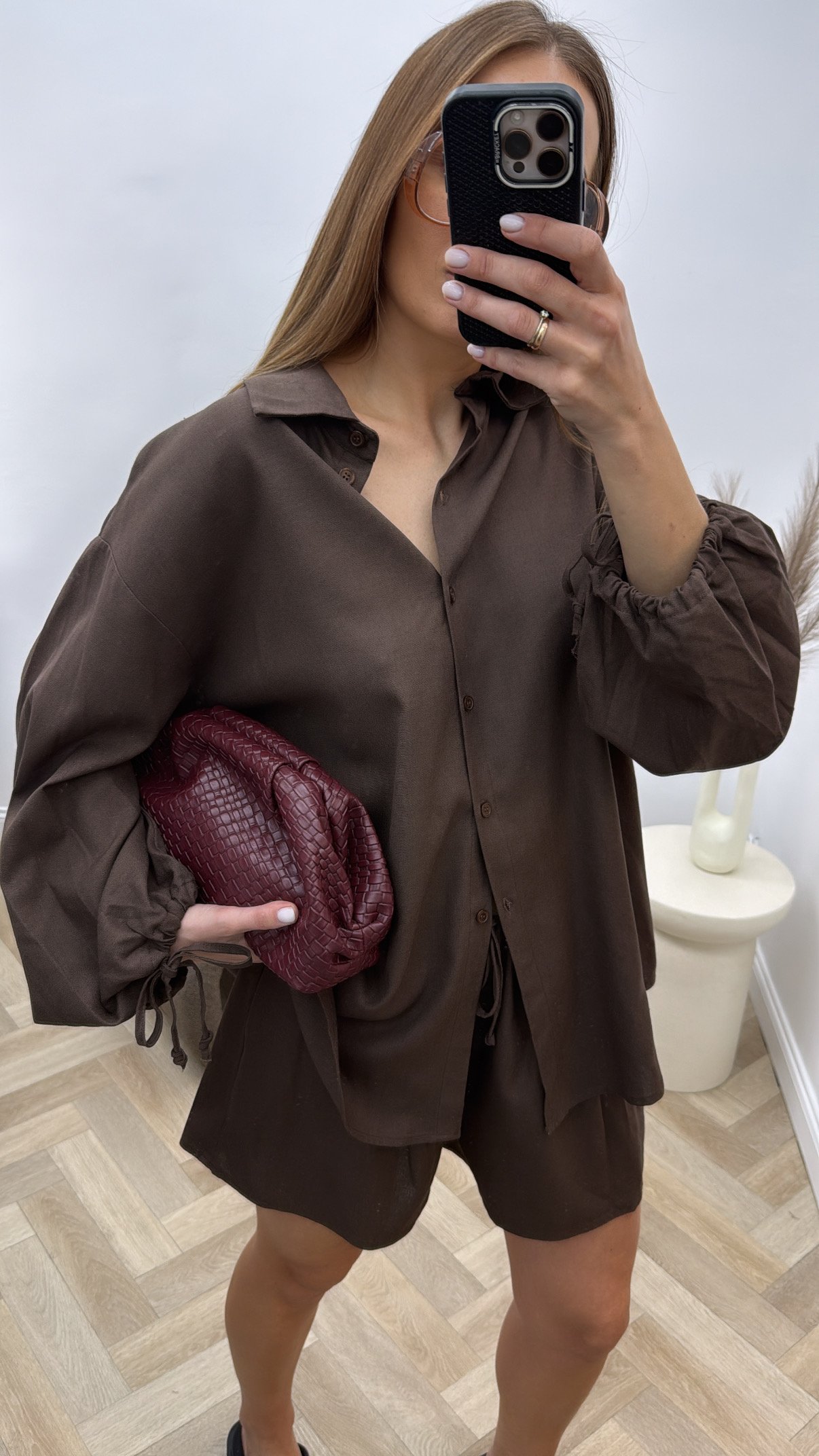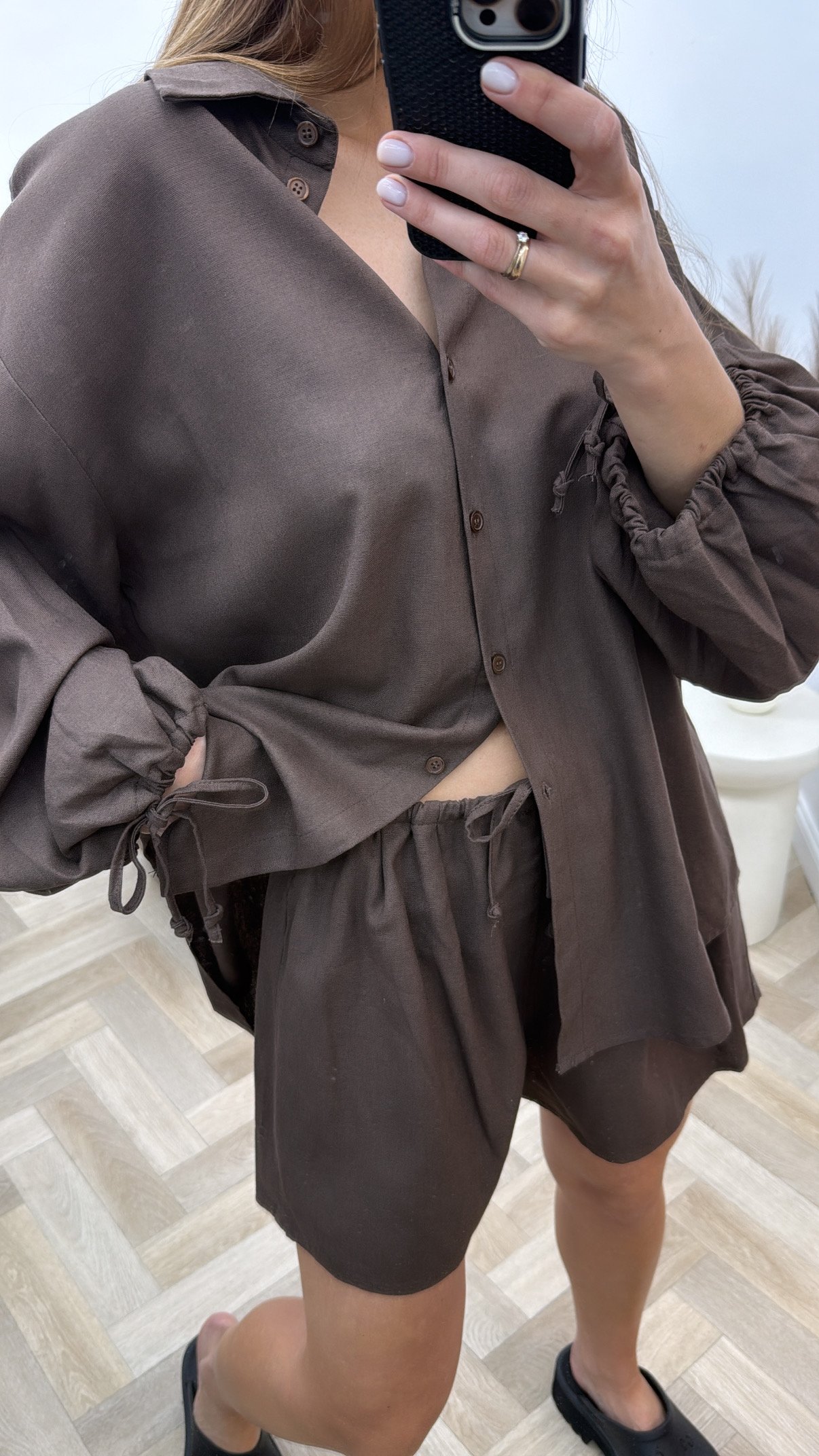 Marškinių ir šortų komplektas. Marškiniai plataus modelio, šortų liemuo reguliuojasi raišteliais.