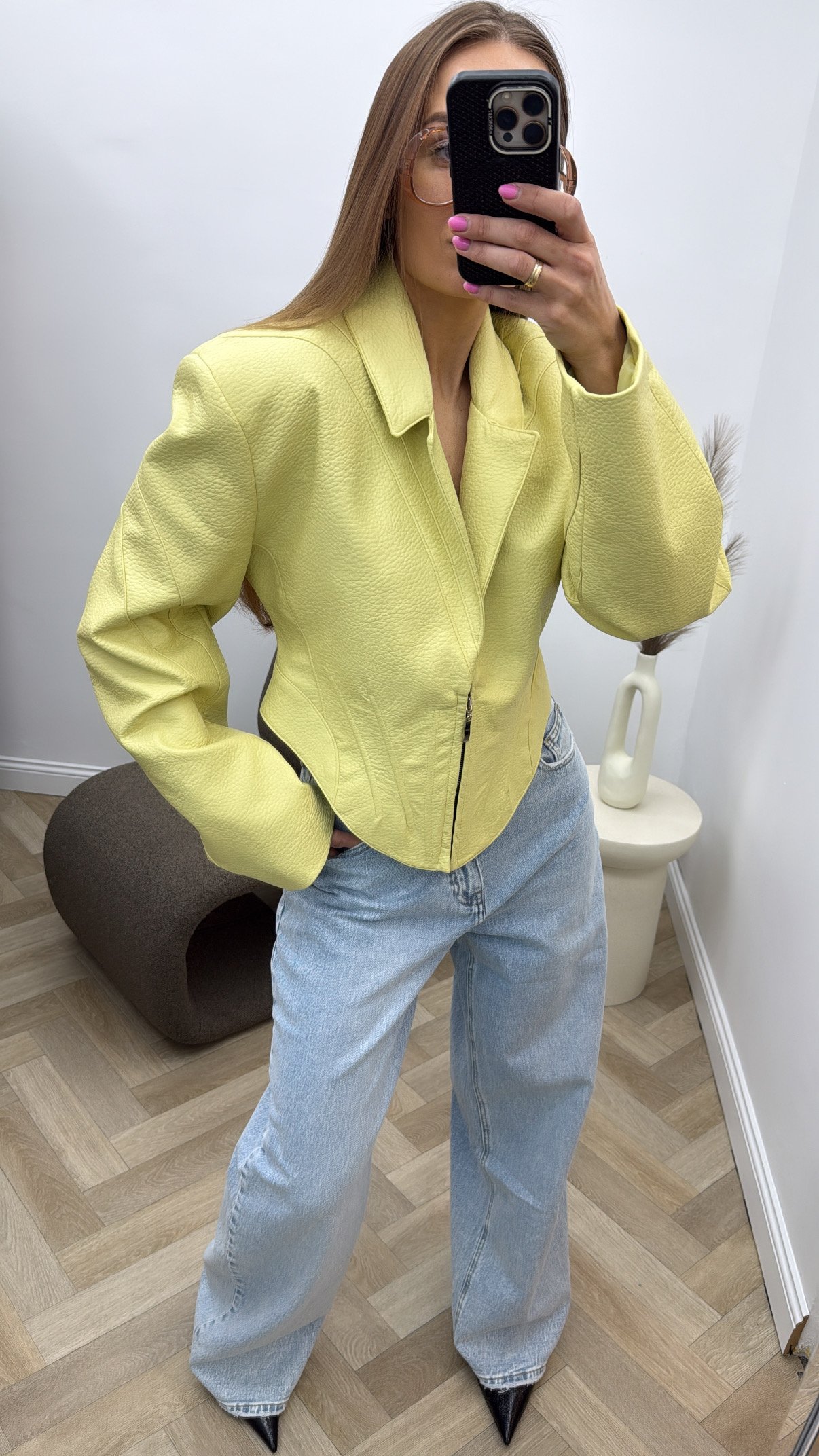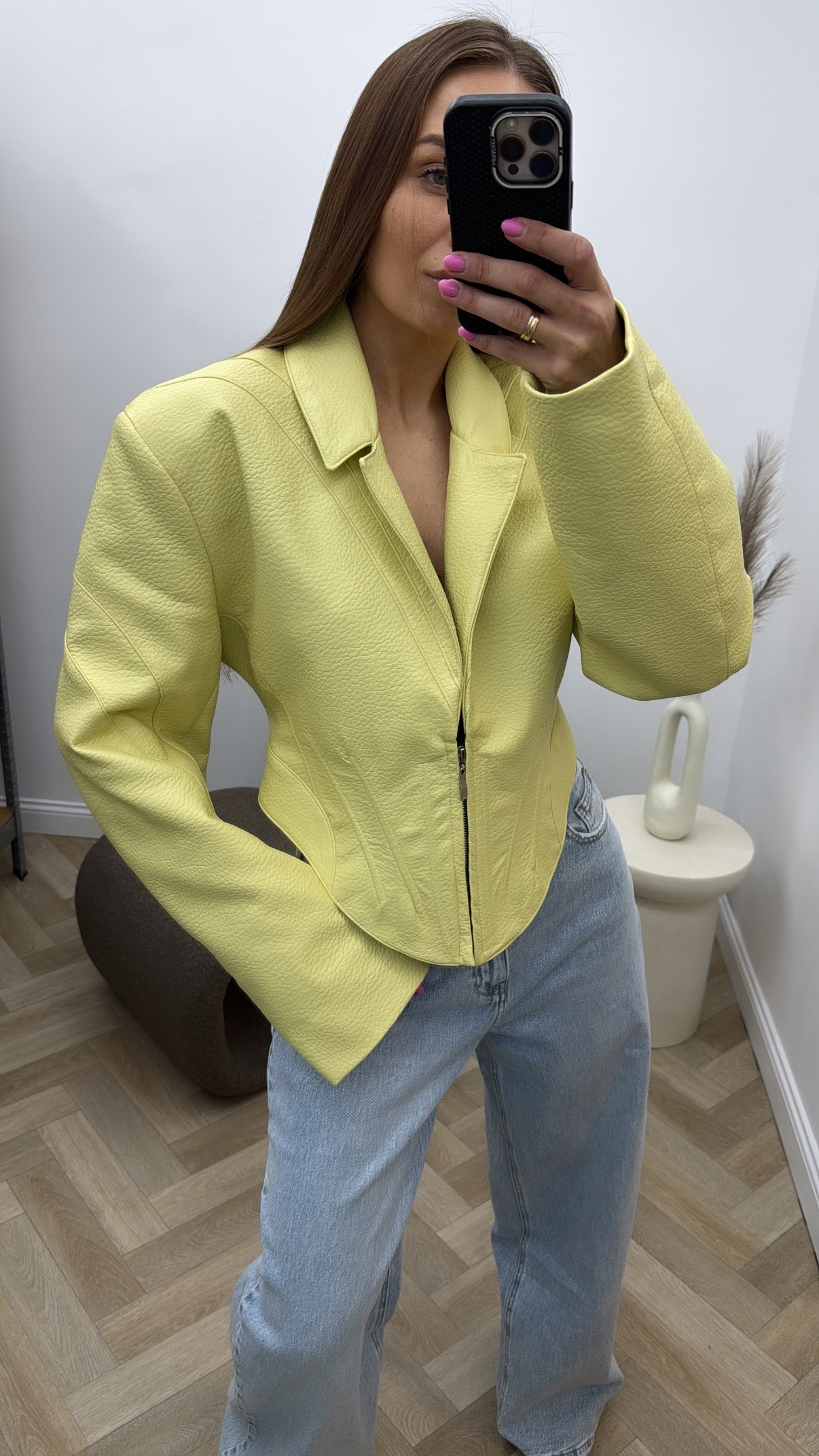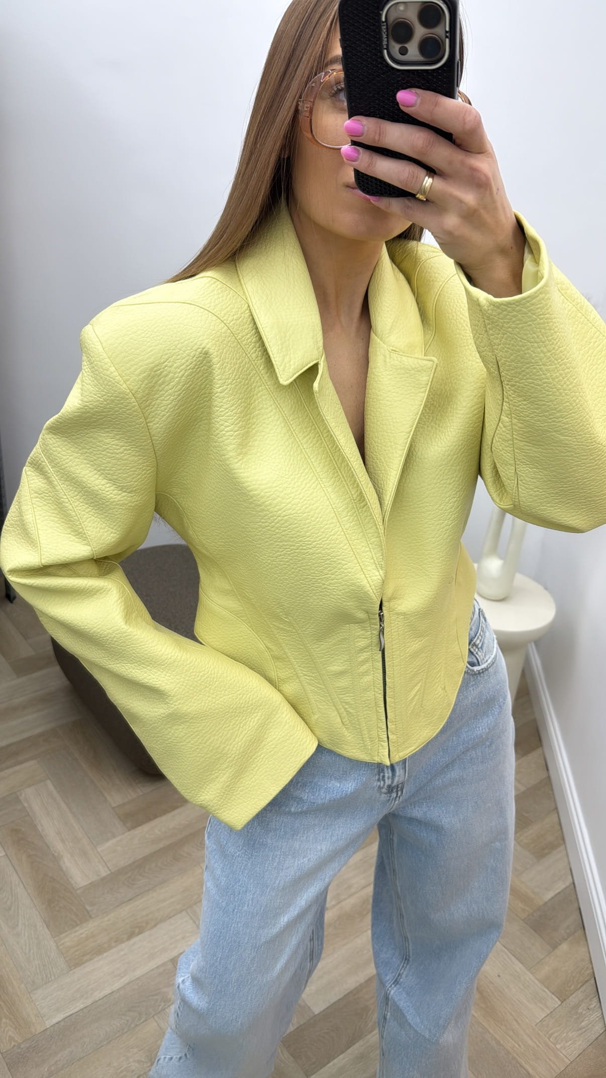 Įliemenuota eko odos oversize modelio striukė.