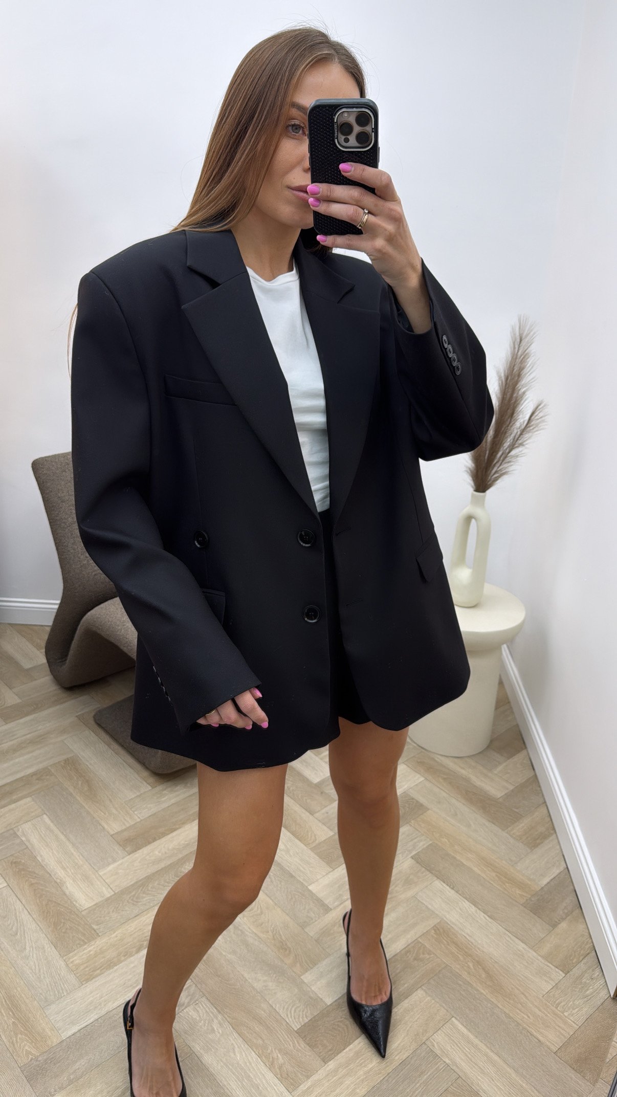 Klasikinis juodas švarkas dėvimas dviem būdais.