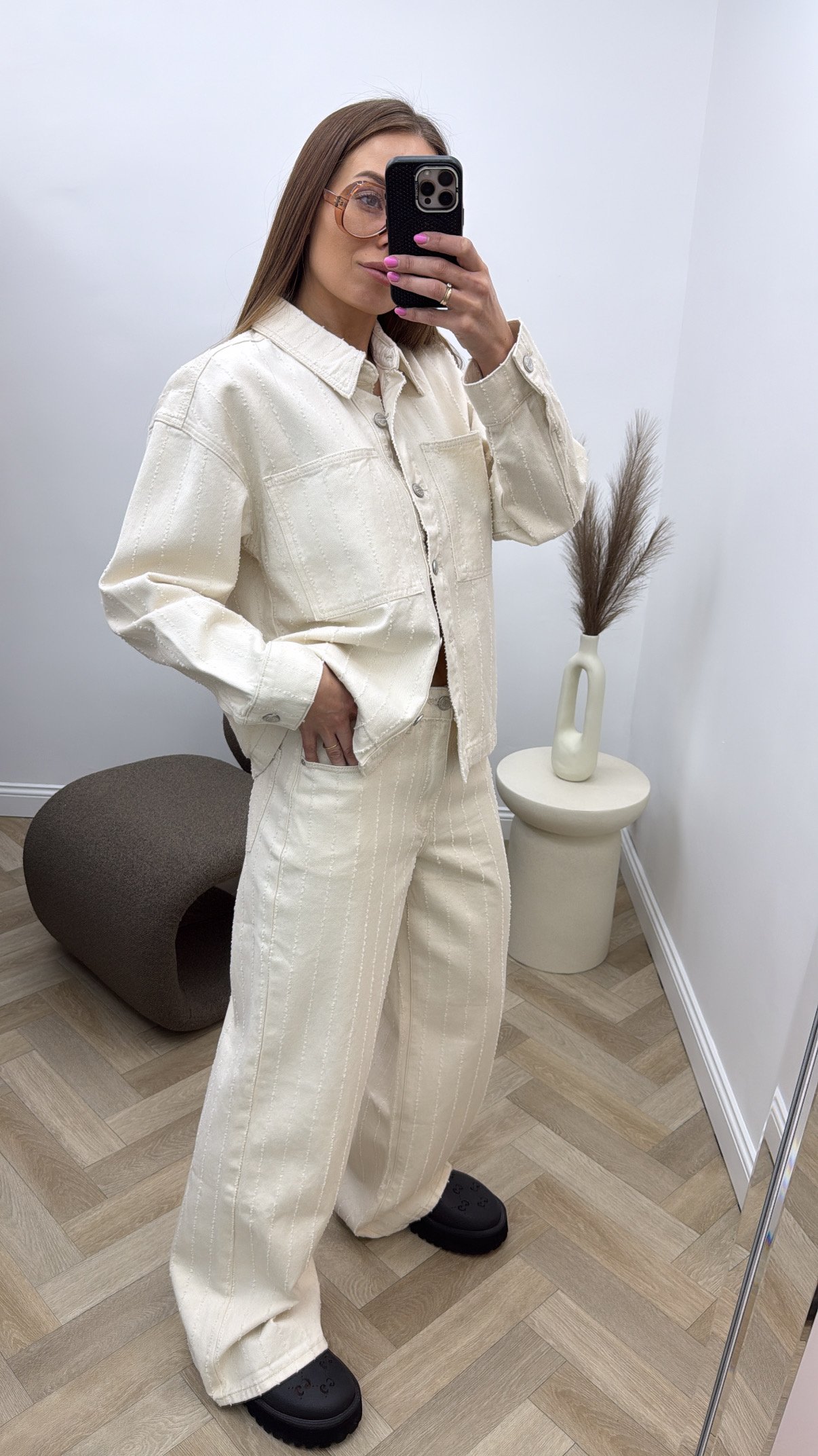 Sviesus denim dzinsai - platus modelis kremines spalvos